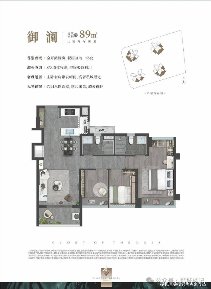 89㎡的3房2厅2卫:设计的是新版竖厅格局,客厅开间3.5米,LDKB一体化,S墙设计预留冰箱位,约11米四面宽超幕视野,主卧套房带衣帽间,U型全开敞厨房,适合改善型家庭 。