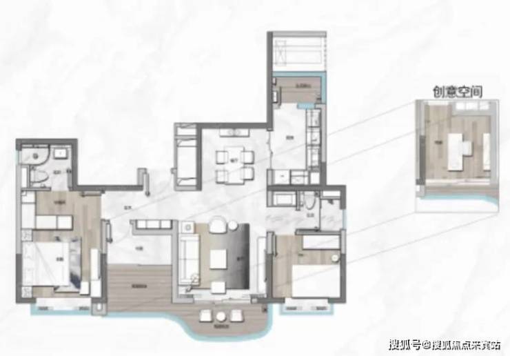 建面115㎡三房两厅两卫,双阳台设计,主次卧分开,私密性好。
