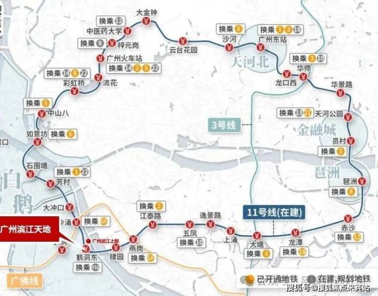 🔘广州11号线以及佛山11号线鹤洞东站双地铁上盖,3横2纵大路网+公交站场+水上巴士,集水、陆、轨等多维交通方式于一体,半小时城央生活圈,1小时湾区生活圈。 11号线共设32个站点,全长44.2km,途经天河、白云、越秀、荔湾和海珠等5个含金量极高的区域,并连接广州火车站、广州东站等交通枢纽。