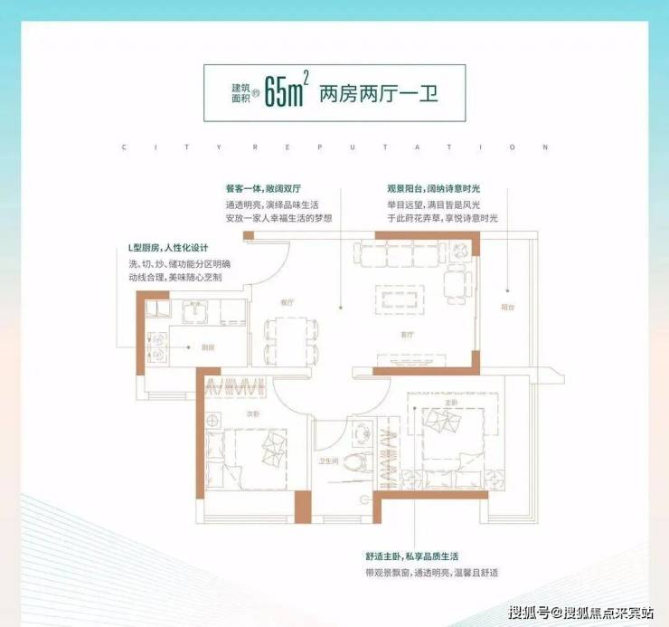 65㎡2房2厅1卫:设计的是竖厅格局,客厅3.3米开间,LDKB一体化,有赠送入户花园(不在户型图内),L型厨房,卫生间干湿分离,得房率:74.71%(不含赠送),全部朝东向看龙凤路。