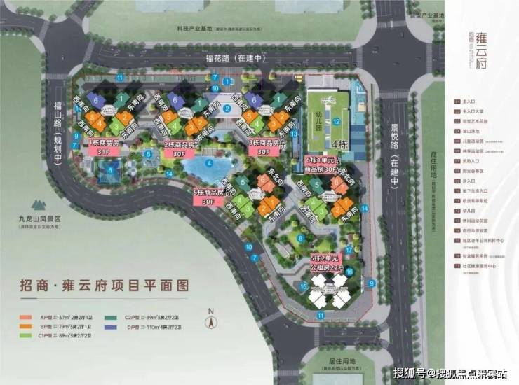 招商雍云府,占地面积约2.7万㎡,建筑面积9.5万㎡,容积率3.59,共由6栋22-31F住宅组成,其中1栋商品房31F,2/3/5栋商品房30F,6栋1单元商品房29F,6栋2单元公共租赁住房22F,4栋是9班幼儿园。总规划1049户(其中商品房927户,公共租赁住房122户),停车位1050个(占比1:1),全部2梯6户设计。