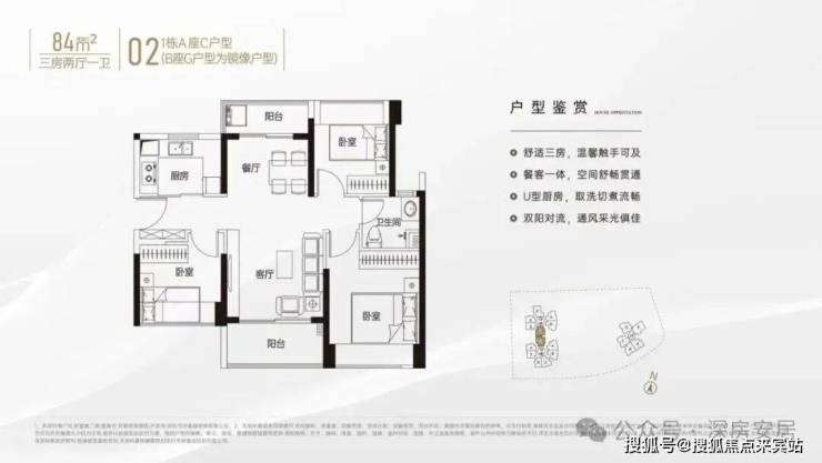 84㎡的3房2厅1卫,1栋A座C户型/1栋B座G户型,设计的是竖厅南北通透格局,客厅3.4米开间,客餐厅双阳台分离化设计,U型厨房,卫生间干湿分离,得房率约79%(不含赠送),客厅阳台主朝东北向。