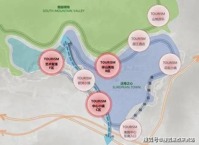 项目重点建设中心小镇C区、艺术聚落F区、伴山美地B区三大园区,并串联现状山地游乐、国王酒店、欧洲小镇与集散中心。