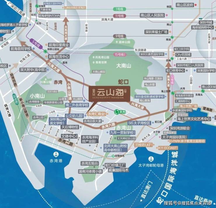 交通方面:地铁交通:步行约200米,即可抵达2/5号线的赤湾站,项目与深圳首条环形地铁15号线紧密相连,为您的出行增添更多选择与便利,此外,周边更有12号线、28号线(规划中)以及24号线(规划中)等地铁线路汇聚,后期连接前海、后海总部基地、宝安中心、留仙洞总部基地、福田香蜜湖等城市价值核心区。