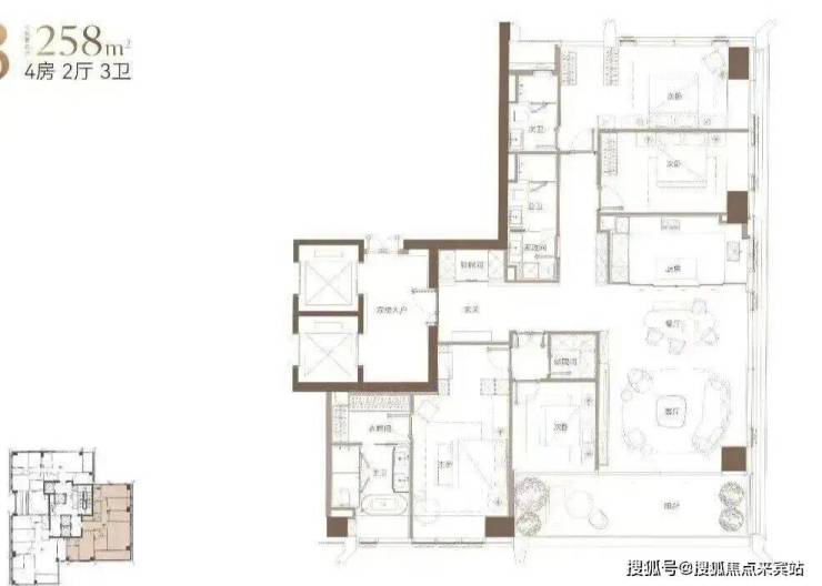 最后是258㎡户型,位于楼栋东南侧,同样为四房三卫(双套间),增设一间家政间,主阳台朝南,直面小区园林,无论是朝向、户型格局还是视野,都是本栋产品中的最优选择。唯一需要提醒的是,若想欣赏东向海景,建议降低预期,因东侧写字楼高度高于本楼栋,务必有个心理准备。