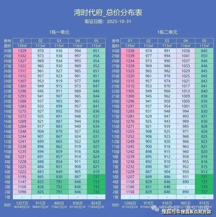 139㎡:2单元01户型(7.84万/㎡)大于1单元01户型(7.77万/㎡),价差约1000元/㎡;