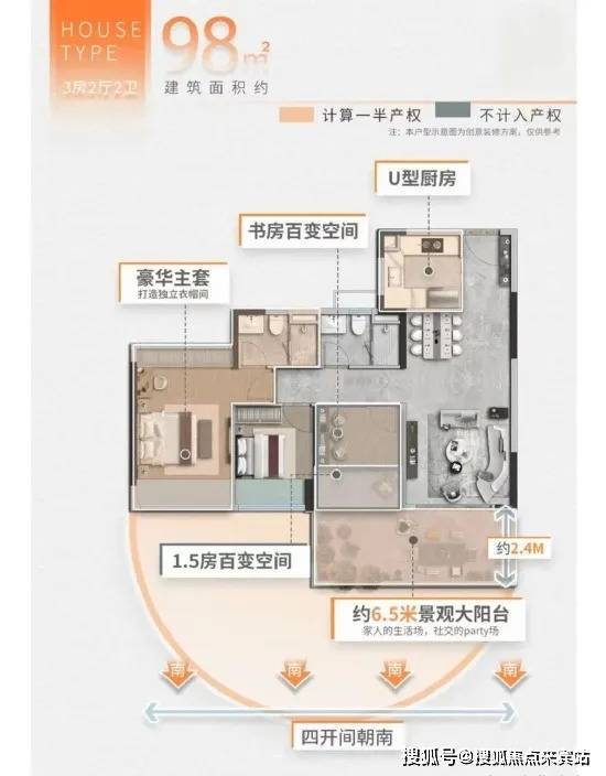 该户型使用面积跟120㎡的二手房差不多。书房改造后进深达到6米,这个场景非常适合双胞胎宝宝居住。同样地,景观大阳台霸气延展到约6.5米,最小进深达也有2.4米。