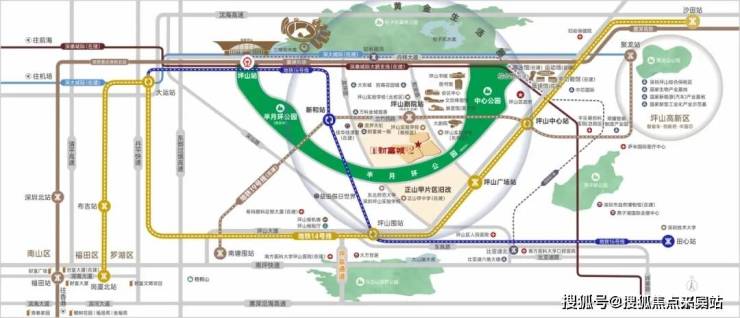 近坪山广场站&新和站&坪山剧院站(暂定名-在建)三地铁口、坪山高铁站六轨交通;一路之隔坪山实验学校,直线约350米东北师范大学深圳坪山实验学校;举步龙坪天虹商圈,1公里范围内益田假日世界、佳漾里(招商中),总体量约17万㎡精粹商业;近坪山文化聚落,一路之隔中心公园&半月环公园(规划中)双公园生态富氧。