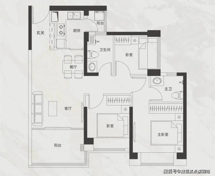 户型格局方正,客餐厨阳一体化,享敞阔通透大厅堂;双阳台双卫浴配置,居家生活、观景皆自在舒适;通透的双次卧,孩子、父母三代幸福乐享,质感主卧套房尺度舒适,精雅之享。