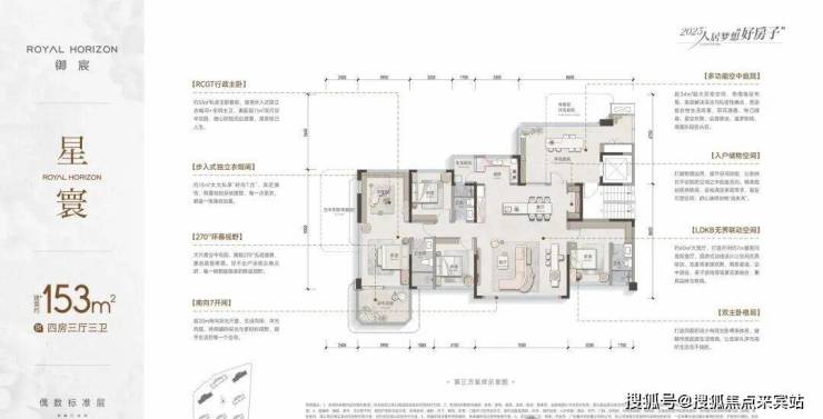建面约153㎡户型,作为119㎡户型的升级之作,不仅保留了原户型的所有优点,更在空间尺度上实现了全面跃升!空中庭院扩大至约34㎡,双厅空间拓展至约60㎡,客厅开间达到7米级别,南向采光面宽达7开间,每一处尺度都令人惊叹。入门处预留的超大储物柜空间,让收纳能力再升级;厨房新增的生活阳台,则为洗衣机、清洁工具等杂物提供了专属收纳区。