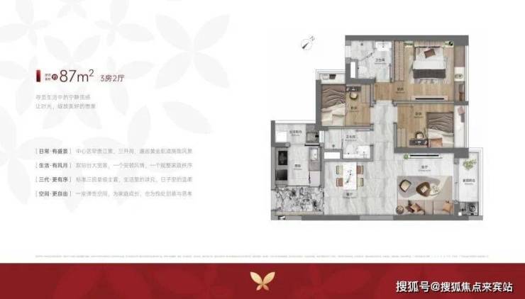 87 平方米三房总价约 360 万起,是刚需家庭的热门选择