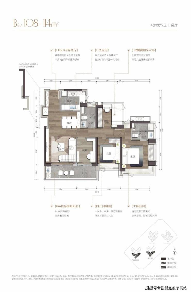 建面约108-143㎡海幕纯四房,臻藏级南向湾海视野,LDKB人性化动线设计,格局方正、高实用率,打造独立玄关、双飘窗主卧、步入式衣帽间等个性化空间。