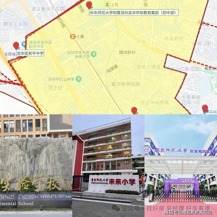 红山片区教育资源突出,项目配建 9 班幼儿园。小学学区为华东师大附属龙华未来小学;初中主要对口龙华区实验学校(至美校区),该校 2024 年中考普高率据称达 78%,口碑靠前。项目同时纳入民治大学区,可参与电脑派位入读华东师大附属深圳龙华学校等优质学府。