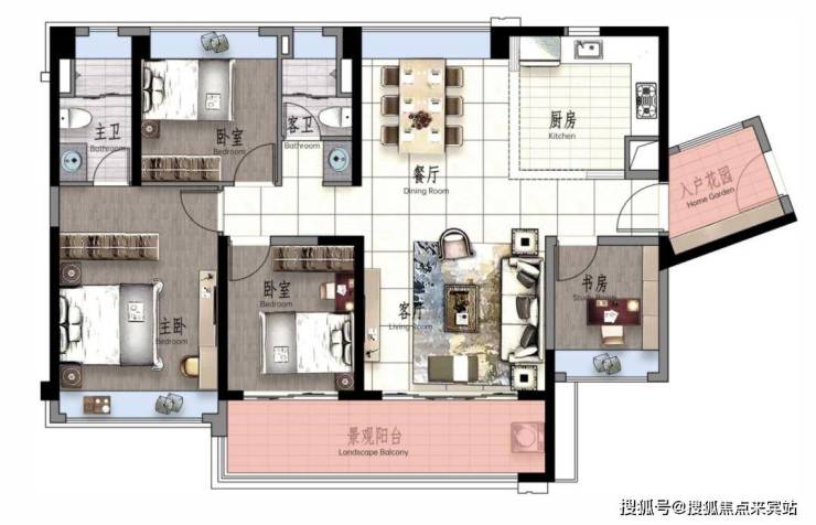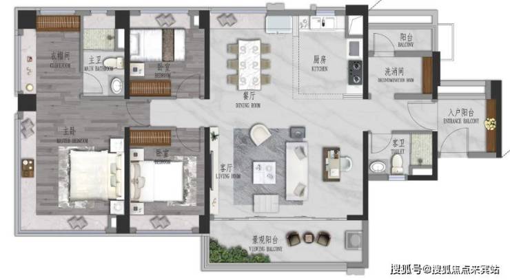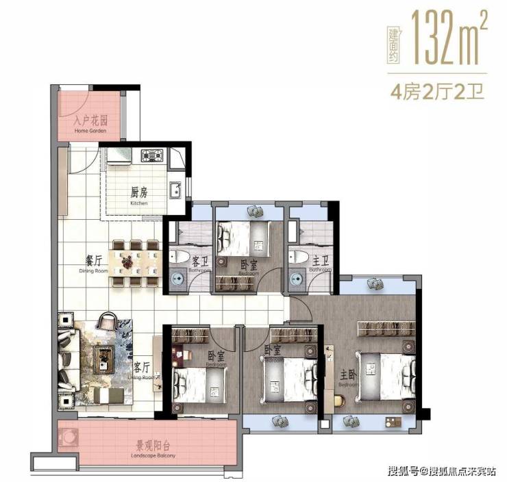 约99㎡3+1房2卫,户型升级,灵动入户空间,南向约6米阳台,尽揽自然景观,主卧套房,私密生活。