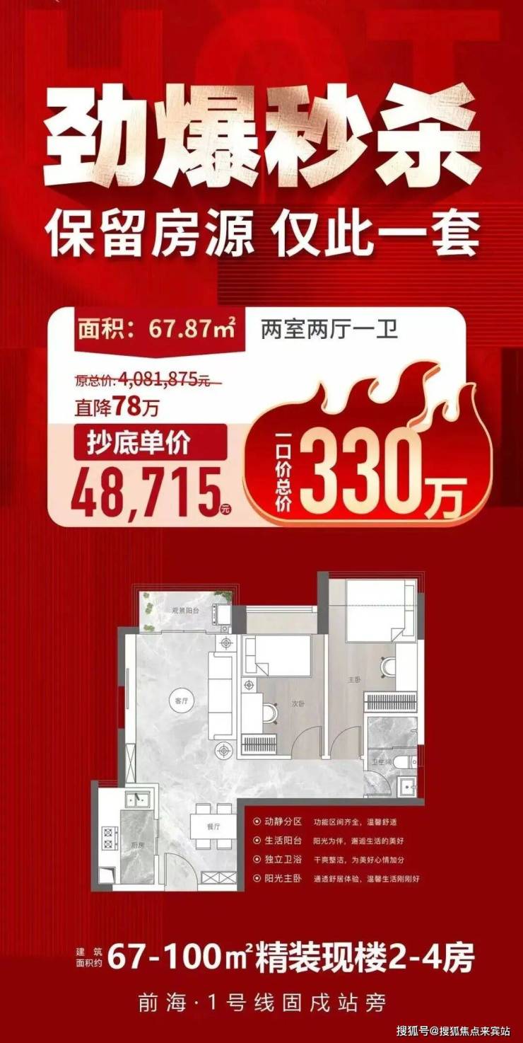 和荣西湾,清盘钜惠,可0首付!1号线固戍站200多米,总价327万起,买68-100平2-4房,精装现房,车位比1:1.66,容积率2.88,小高层(12-13层),小区全铝板外立面