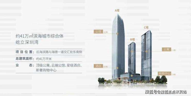 项目总占地约2.5万㎡,总建面41万㎡,包含三栋超高层建筑(最高310米)及下沉式商业,是深圳湾片区稀缺的地标性物业。定位为集超甲级写字楼、高端公寓、都会商业于一体的滨海城市综合体。