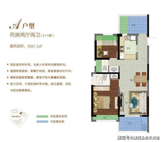 B户型:85.36㎡两房两厅两卫