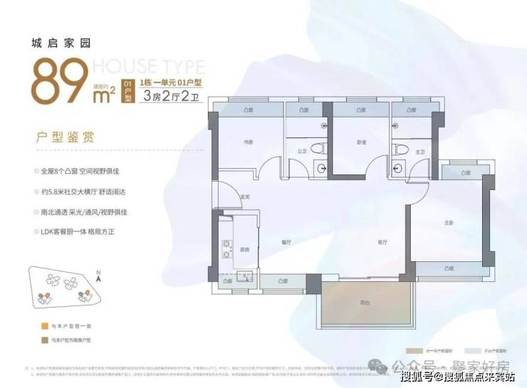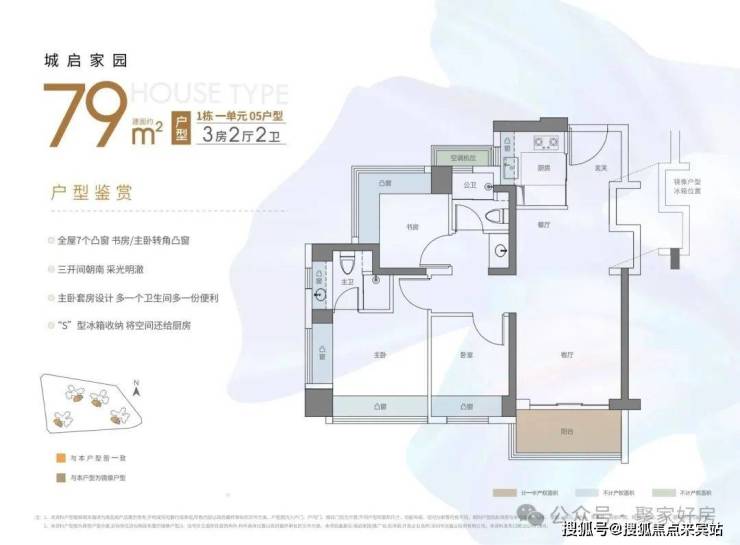 东南或西南朝向,竖厅设计,客厅有预留冰箱位,客厅,主卧,次卧分别朝南,户型一共有8个飘窗,加上阳台和飘窗使用率在90%左右。