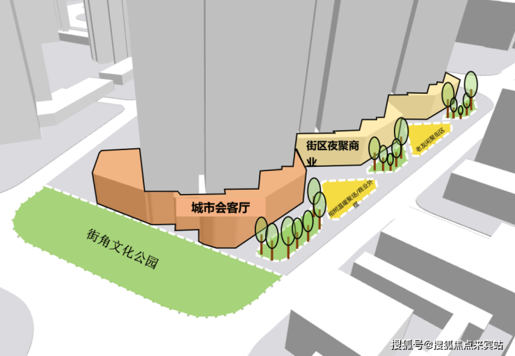 从流传出来的方案设计图,可以看到越秀采用了城市会客厅+街角文化公园+榕树要素,将打造老友闲聚街区、榕树温暖聚场等,确实很广府调调。