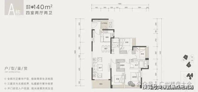 建面 140㎡四房:主力户型(货量最多),分横厅、竖厅设计,横厅空间开阔(适合家庭互动),竖厅动静分区明确(适合多代同堂),南向望花园,舒适度高;
