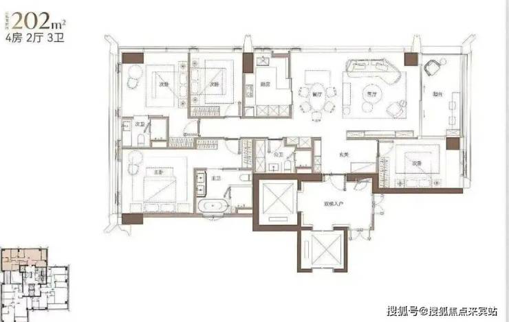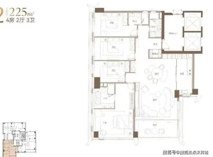 接着是225㎡户型,该户型与前期295㎡户型相似度极高,位于楼栋西南侧,同样为四房三卫(双套间),四个次卧均拥有大面积西向采光,主阳台朝南,可直面小区园林景观,需注意的是,南向将规划一栋超60层的酒店式公寓,可能会在部分时段遮挡采光、产生楼体阴影,但综合来看,该户型实用性强,以比295㎡小70㎡的情况下很好的呈现了该户型的功能性与优势,是一个不错的选择。