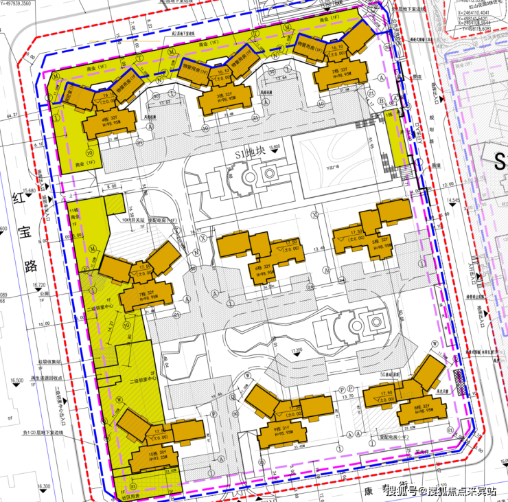 S1地块用地面积34283.41㎡,总计容建筑面积129820.00㎡,绿地率35%,由9栋塔楼、裙房和地下室组成,总停车位1255个。