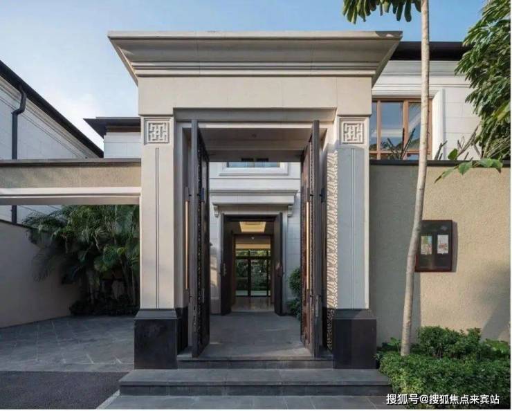 海棠潮鸣别墅统一采用二层造型,形体比例舒适宜人,墙面以仿石涂料为主,突出的门头位置采用葡米石材,主体以均衡的虚实比例及考究的细部线条营造价值感。屋顶采用仿柚木铝合金的深远挑檐及平坡结合的方式,打造热带风情和度假氛围。