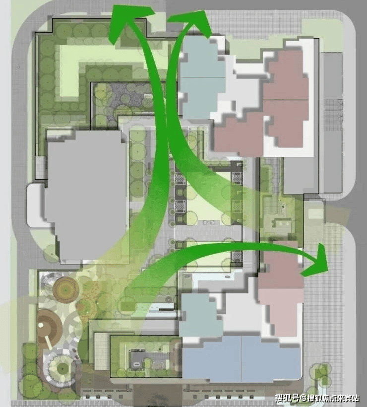 微风绿谷:沿内部庭院设置一圈风雨连廊,形成廊下漫游空间,实现近人空间的游走体验,提供丰富的檐下生活场景;小区庭院东、南、北三个方向均设置有架空等开敞空间,有利于改善气候条件,形成对流风。这些也都体现出浓厚的岭南建筑的空间特色。
