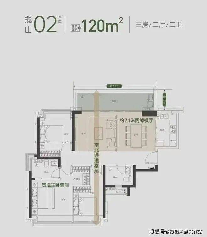 120㎡横厅户型看山,竖厅户型更靠近北环大道。横厅户型每一层有两个房源,客厅阳台和一个次卧朝东北,主卧、另一次卧及卫生间朝西南,客餐厨一体化+大阳台,视野上更加开阔。主卧借走隔壁次卧的一部分空间做成一个衣帽间。整体上动静分离,户型方正,视野开阔。