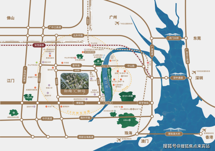 【駿瓏··汇景湾】屹立大湾区核芯佳地,坐落于博爱路的源头——博爱一路与翠景道两条主干道之间,扼守中山城区西大门,纵享105国道、广珠公路、江中公路等,直驳广珠城轨、广珠西线等高速交通路网,轻松直达大湾区,与世界无边界交汇。