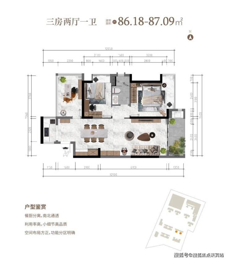 户型:三房两厅一卫 建面约86.18-87.09㎡