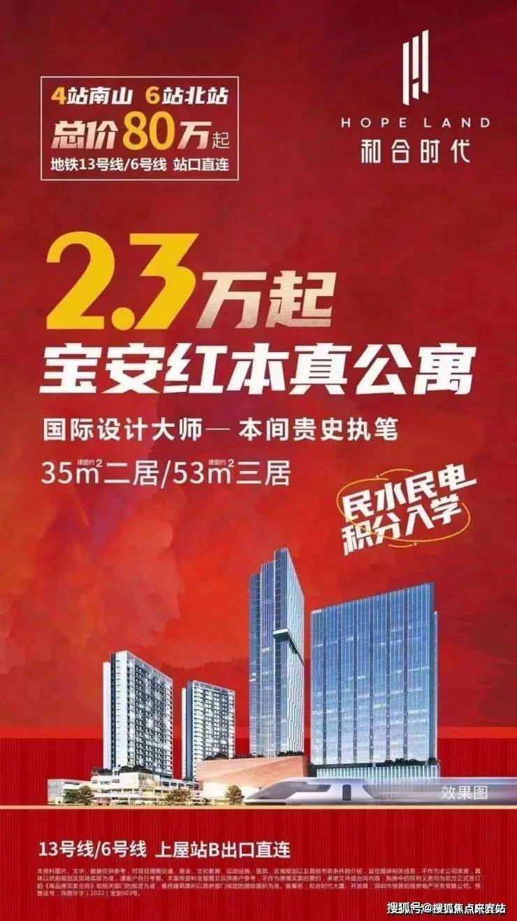 和合时代宝安目前在售公寓最低单价,仅2.3万起,总价80万起买精装两房!!真公寓、通燃气、带阳台、可积分上学、精装交付层高:3.6米,35㎡两房 折后约80-110万,53㎡ 三房折后约140-180万,项目楼下就是双地铁口6和13号线的交汇处,13号线地铁5站抵达留仙洞总部基地,6站西丽高铁站,7站南山科技园,12站深圳湾超级总部基地
