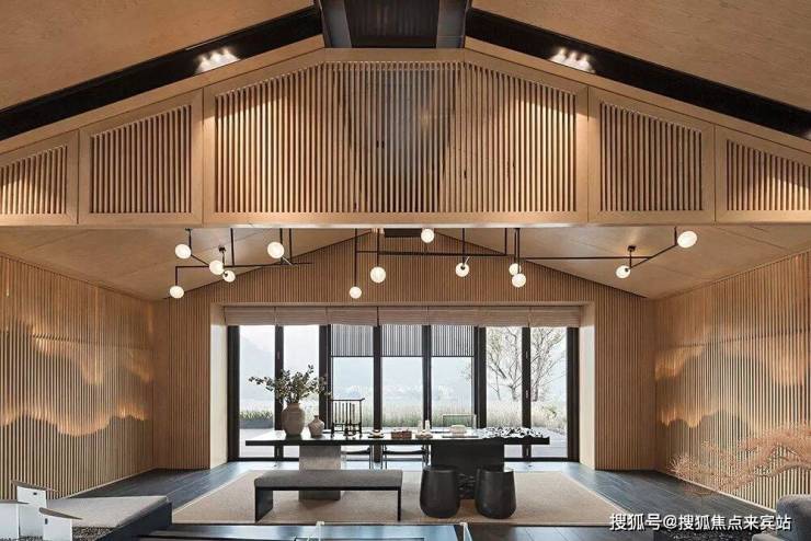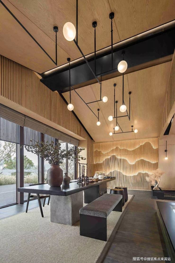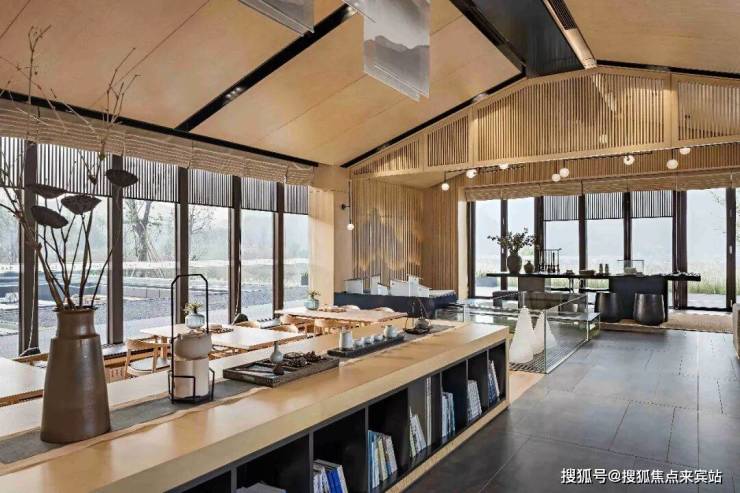 赏外景之美,入空间会意,诗的意趣逐渐蔓延开来,暖色调的原木将空间温度提升,苍劲黑白的水墨,也似有了温度。