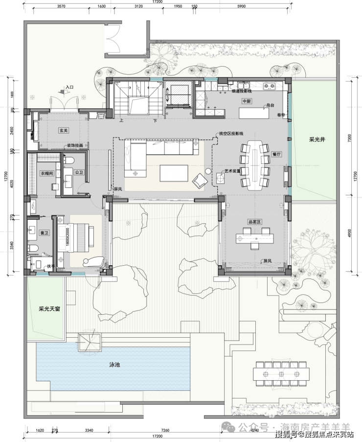 C户型(U字型)建筑面积:约175㎡,5房4厅7卫+2保姆房+2车位+1庭院泳池,使用面积968m²-1297m²