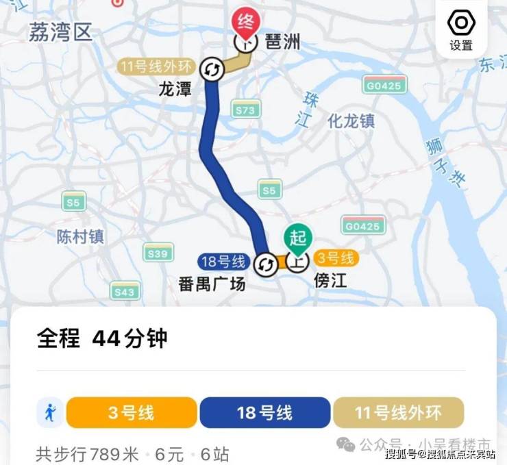 地铁去往琶洲:同上,步行至地铁口乘坐3号线到番禺广场换乘18号线,再到龙潭换乘11号线,再到琶洲,全程6个站,耗时44分钟左右。