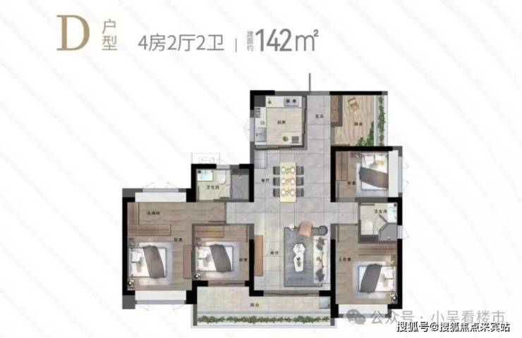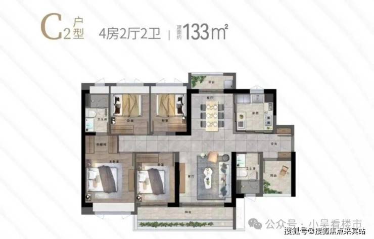 建面133平四+一房两卫,6.6米阳台,超长采光面,餐客厅一体化,主卧带独立衣帽间,总价37X万起。