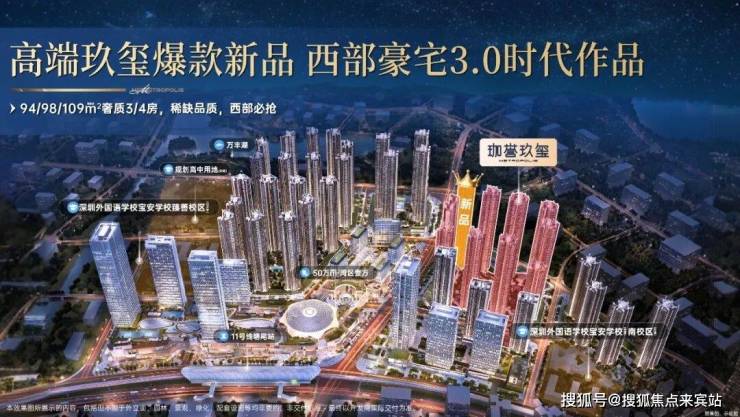 鸿荣源珈誉玖玺位于深圳宝安大道与凤塘大道交汇处东南侧,是鸿荣源珈誉府三期住宅,也是整个项目的收官之作。项目总占地面积约4.79万㎡,总建筑面积约40.53万㎡,容积率5.42,绿化率40%,共由10栋31-48层住宅组成,总规划2479户,全部为商品房。