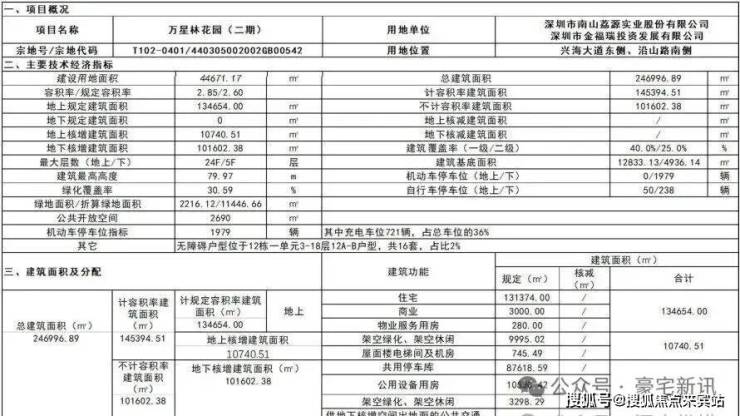 万星林花园项目位于前海合作区南山街道兴海大道东侧,沿山路南侧,宗地号T102-0401。根据本项目《深圳市国有建设用地使用权出让合同》及《建设用地规划许可证》,项目总用地面积53819.80平方米,用地性质为二类居住用地;计规定总建筑面积139654平方米,其中住宅131374平方米、商业3000平方米、幼儿园5000平方米(独立占地面积5400平方米,18班)、物业管理用房280平方米;规定容积率≤2.6;建筑一级覆盖率≤40%,二级覆盖率≤25%;建筑高度限高80米;机动车泊位数1979辆;地块内需提供不少于2690平方米公共开放空间。