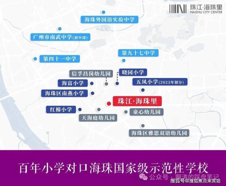 1公里内超12所公立学校环伺,根据2023年招生文件指引,百年老校五凤小学的对口中学有9家,包括:南武中学校本部(国家级示范性学校)、第九十七中学(省一级)、海珠外国语实验中学(省一级)、第四十一中学校本部(省一级)等。