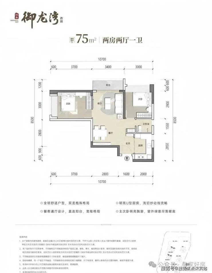 75㎡2房1卫,分布在1栋3/4单元03/06户型,设计的是竖厅稀缺的双龙抱珠格局,客厅开间3.4米,U型厨房,卫生间三段式分离设计,得房率约73.26%(不含赠送),东南或西北朝向,加上赠送得房率约80%