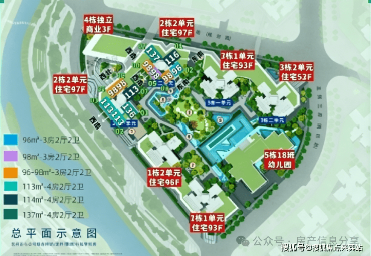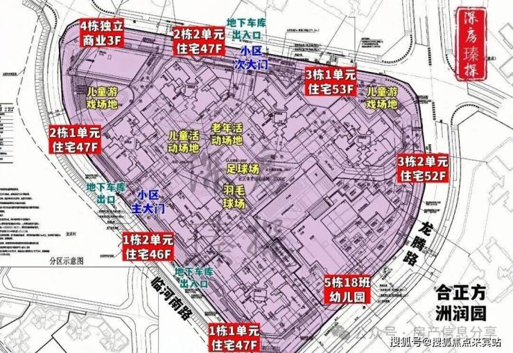 合正方洲・瀚府总占地约3.05 万㎡,总建筑面积约27.4 万㎡,计容建面约20.11 万㎡,容积率6.6,绿化率40.01%。项目由6 栋 46–53 层高层住宅组成:1 栋 1 单元、2 栋 1/2 单元为 47 层,1 栋 2 单元为 46 层,3 栋 1 单元 53 层、3 栋 2 单元 52 层;社区内配建1 所 18 班幼儿园,并规划儿童活动场地、羽毛球场、足球场等全龄休闲空间。