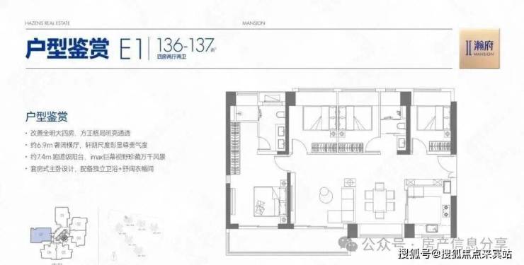 136–137㎡ 4 房 2 厅 2 卫|E1 户型西南朝向,采用南北通透横厅格局,客餐厅开间达 6.9 米,LDKB 一体化设计,空间开阔大气。户型四开间朝南,全屋配备 7 面飘窗,采光与景观面拉满。主卧为套房设计,带步入式衣帽间,尺度奢适;三个次卧朝东北,布局合理。客厅连通次卧,打造7.4 米超长景观阳台,视野与实用性兼备。U 型厨房操作流畅,公卫为三段式干湿分离,居住舒适度高。不含赠送面积,得房率约 78%。