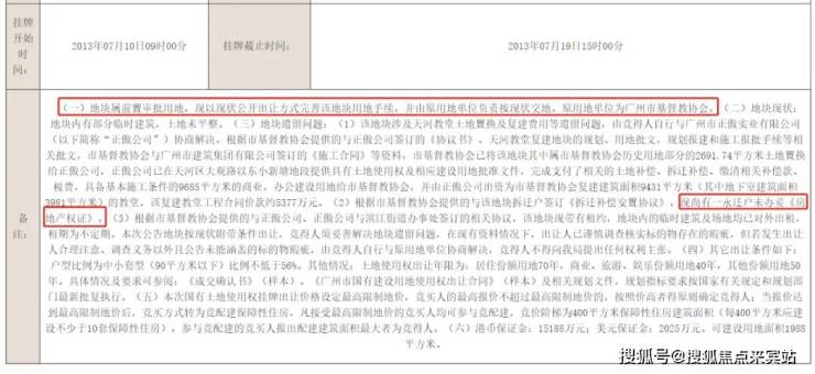原来,这地块原用地单位为广州市基督教协会,招拍挂时地块仍涉及天河教堂土地置换及复建费用、带租约的临时建筑等遗留问题,且地块内尚有未办妥拆迁补偿协议也待协商解决。