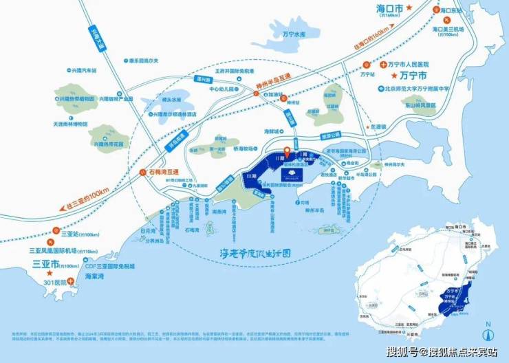 项目与高铁神州站直线距离仅约6公里,2站即达三亚、5站即达海口,约6公里即达海南环岛高速神州半岛匝道出入口,约10公里即达兴梅大道,轻松环游全岛。往北约53公里即达琼海博鳌机场,乘高铁5站即达三亚凤凰机场(约110km)、4站即达海口美兰机场(约150km),全国主要城市航班直飞。