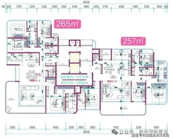253–332㎡家族平层:2T2板楼设计,独立入户,双主卧套房均带海景卫浴,视野无遮挡,定位为顶奢客群。