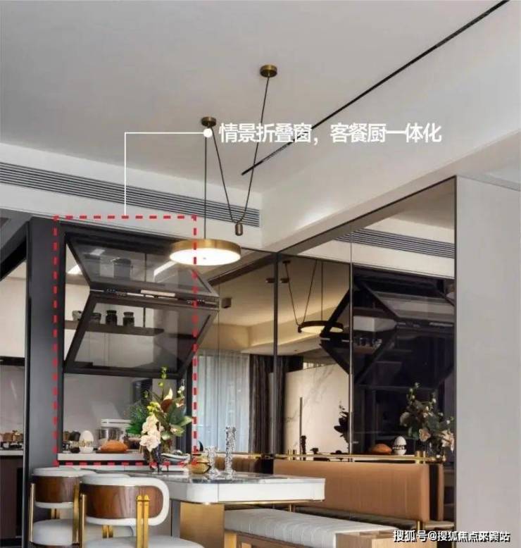 厨房采取折叠窗设计,营造透明“开放式”厨房,隔绝油烟的同时,增强烹饪的趣味性。