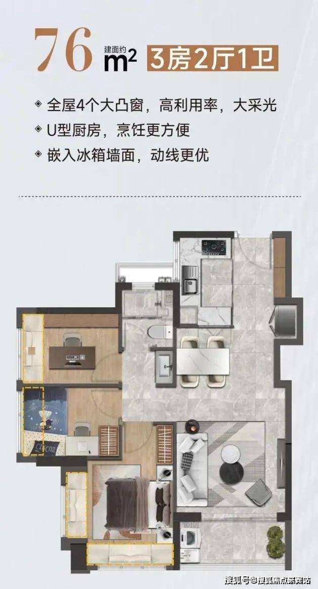 【建面约76㎡精致3房】以小面积打造高实用户型,在有限空间里展现无限张力。