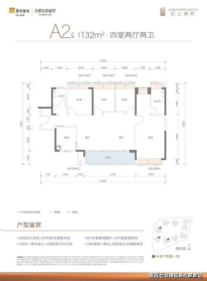 132㎡的4房2厅2卫,A2户型,设计的是横厅南北通透格局,进门独立玄关,客餐厅6.1米开间,LDKB一体化,4个卧室分别做到了3.5米/3米/2.65米/2.45米的宽度,主卧大套房设计,U型厨房,公卫三段式分离设计,得房率82.83%(不含赠送),阳台主朝东南向。