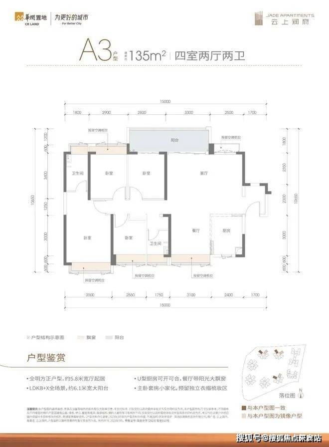 135㎡的4房2厅2卫,A3户型,设计的是竖厅超大宽厅格局,进门独立玄关,客厅5.8米开间,LDKB一体化+X全场景,4个卧室分别做到了3.5米/2.9米/2.8米/2.55米的宽度,主卧大套房设计,客厅连接次卧出6.1米长的大阳台,U型厨房,公卫三段式分离设计,得房率83.65%(不含赠送),阳台主朝东北或西北向。