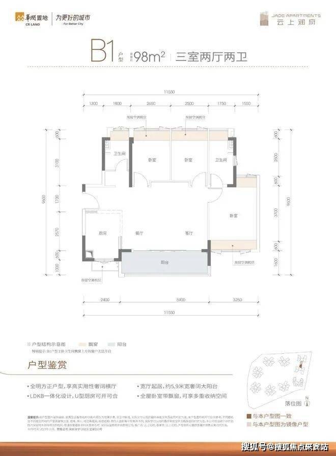 98㎡的3房2厅2卫,B1户型,设计的是横厅南北通透格局,客餐厅5.9米开间,LDKB一体化,3个卧室分别做到了3.25米/2.65米/2.5米的宽度,U型厨房,公卫三段式分离设计,得房率81.23%(不含赠送),阳台主朝东南向。